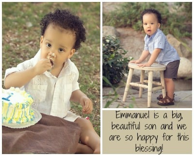 “Just wanted to share that Emmanuel turned one a couple of weeks ago. He is a big, beautiful son! He is very tall for his age…off the charts the doctor says. We are so happy for this blessing. He is walking and talking some; he even says “bless you” after someone sneezes, too cute!